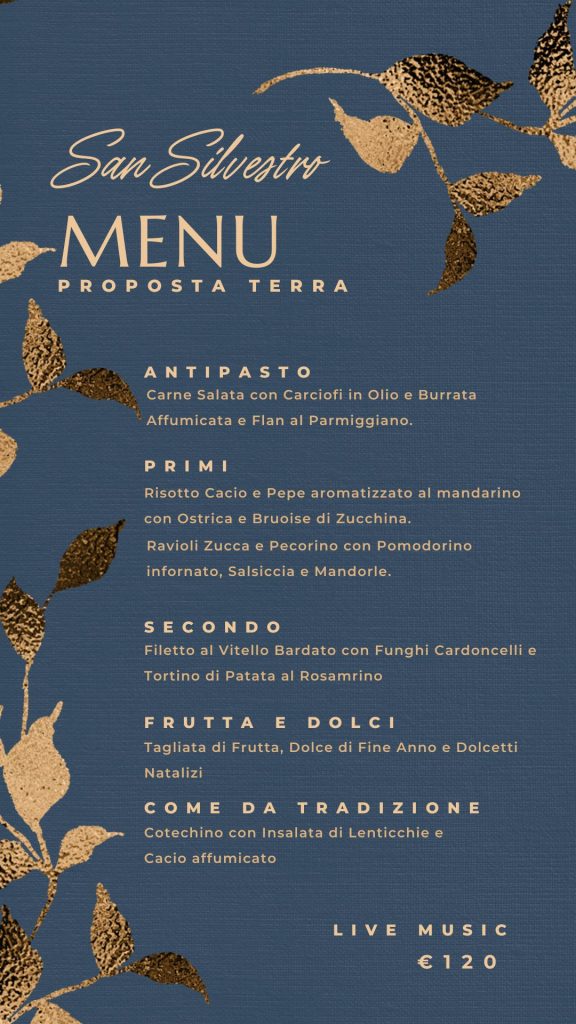 Il Menu di Terra celebra le radici della cucina pugliese con piatti ricchi, autentici e profumati di tradizione. Carni selezionate, ingredienti del territorio e sapori caldi accompagnano gli ospiti in un percorso gastronomico raffinato e appagante. Un viaggio nella nostra terra per salutare l’anno con gusto e convivialità.